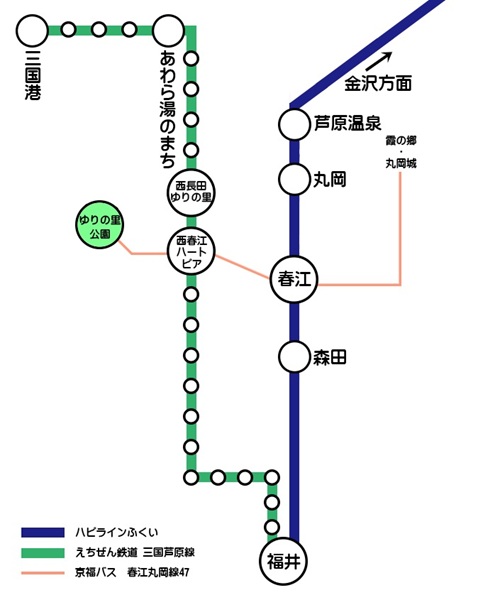 | 【JR線】 | 福井駅・もしくはあわら駅 下車 えちぜん鉄道もしくはハピラインふくいへ乗り換え |
