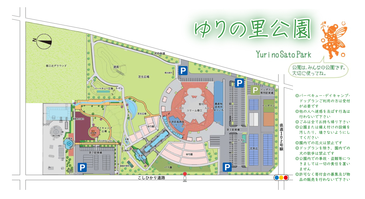| ドッグランご利用時の注意事項 | ドッグランをご利用のお客様は、ドッグラン専用駐車場をご利用ください。 ※ドッグラン以外の公園施設(ユリーム春江およびその近辺・圃場・花壇・芝生公園・イルミネーション施設・BBQ場・デイキャンプ など)はペットの入場を禁止しております |