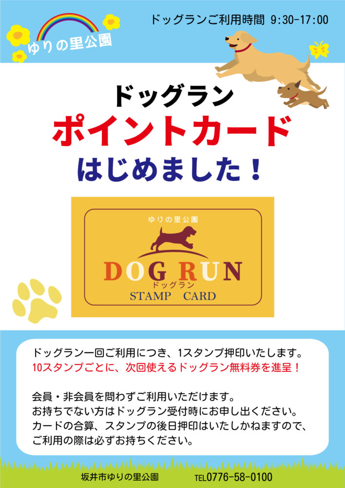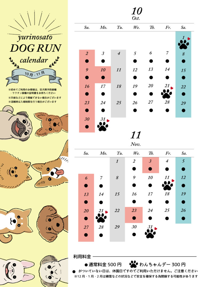 - 会員の方のみ『ワンちゃんの日』(1のつく日、休園日除く)が300円でご利用できます
