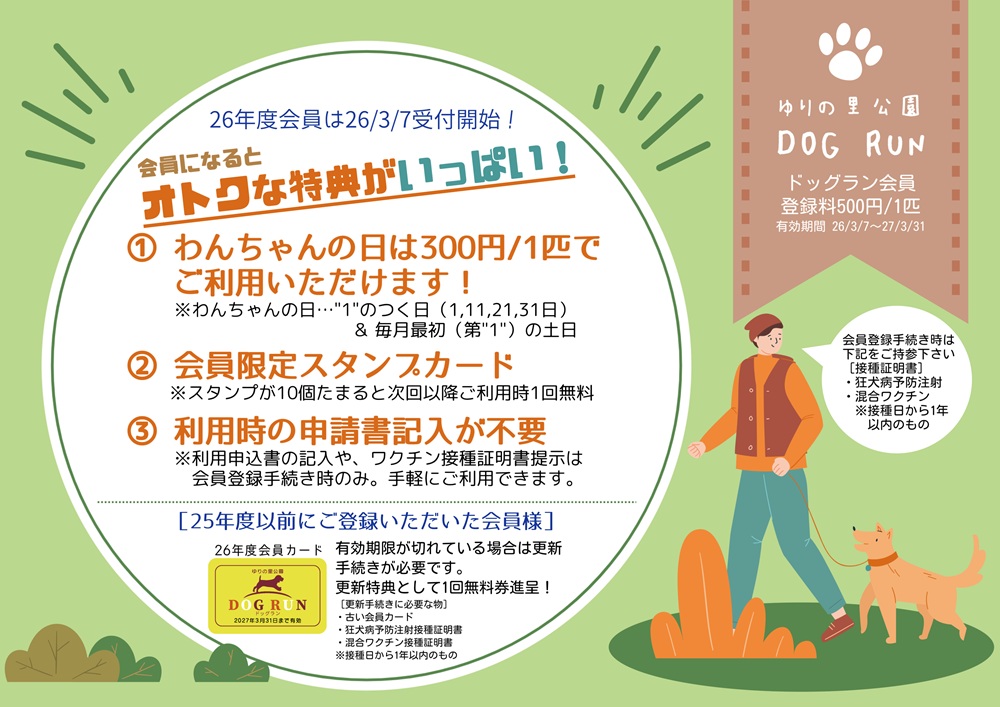 更新手続き特典として、次回より使用できるドッグラン無料券(1回分)を進呈いたします。