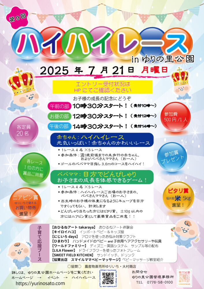 ◯お子様の安全を最優先とするため、ステージに上がれるのはレースに出場する赤ちゃんと、そのお父様・お母様のどちらかお一人 のみとなります。付き添いの方は観覧エリアでごらんください。