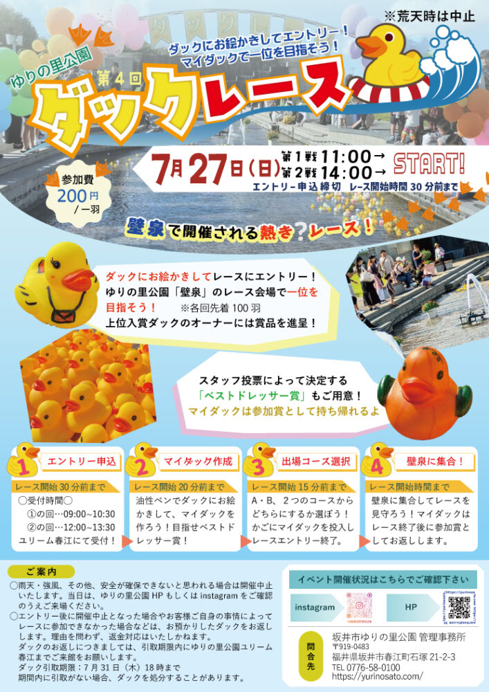 | ◯レースに参加できなかった方は後日ダックをお返しいたしますので、ゆりの里公園 ユリーム春江受付カウンターまでお越しください。 ダック引取期限 7/31(木) 18時まで 期限内に引取のないダックは処分させていただくことがあります。 |
