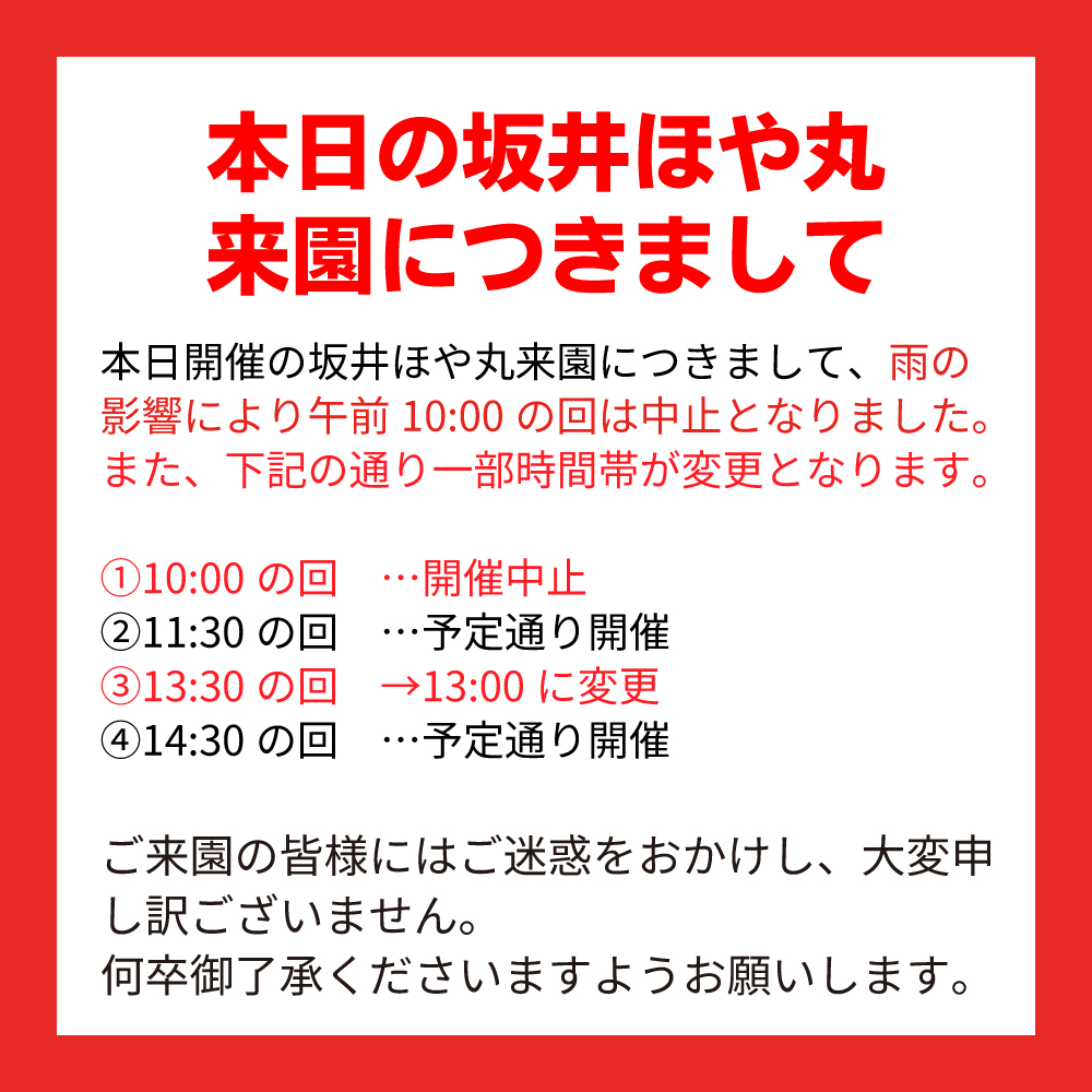 本日開催の坂井ほや丸来園につきまして、雨の影響により午前10:00の回は中止となりました。