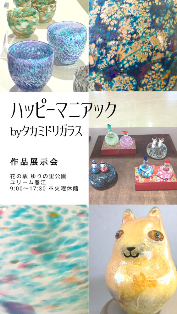 ただいまゆりの里公園の「ユリーム春江」館内では、【ハッピーマニアックbyタカミドリガラス】様のガラス作品「ミニ展示会」を開催しております!海外生活で培われた独特の色彩感覚で生み出す“色”は、まさに唯一無二。鮮やかでいてやさしく、大胆で繊細。遊びココロ満載のにゃん🐱ちゃんもいたりして、見ていて飽きません!一部作品は販売もしております。お気に入りの一品が見つかるかも👓️展示期間は1週間程度を予定しておりますので、お早めにご覧ください。