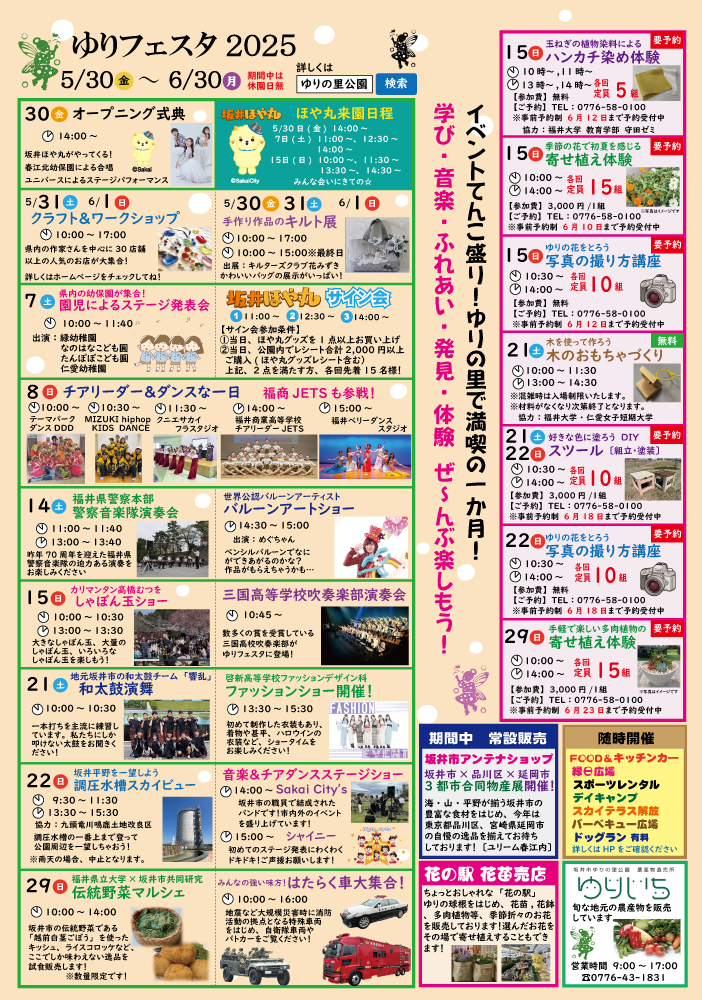 また、坂井市アンテナショップ、花売店「花の駅」、農産物直売所「ゆりいち」などは曜日を問わず毎日開店。