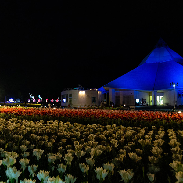 毎日18:30~21:00までは、園内のあちこちでライトアップがお楽しみいただけます。特に、ゆり圃場の中央にある壁泉では、毎時00分・30分毎にプロジェクションマッピングが放映されます。(ゆり圃場のライトアップはありません)