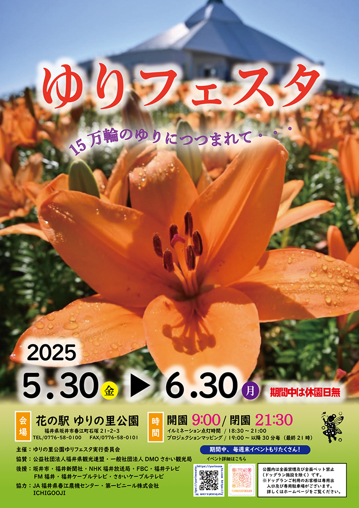 ゆりの名前を冠した「坂井市 花の駅ゆりの里公園」では、毎年6月になると約20種15万輪のゆりの花が咲きほこります。